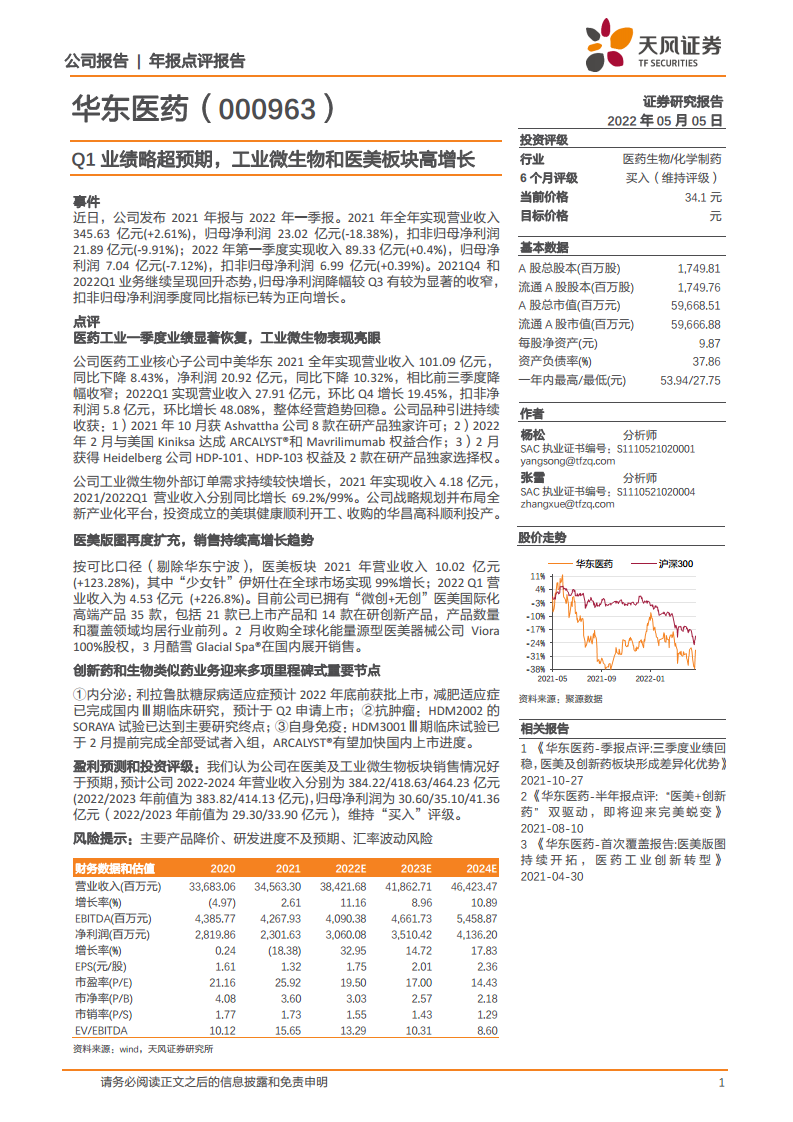 华东医药(000963):Q1业绩略超预期,工业微生物和医美板块高增长