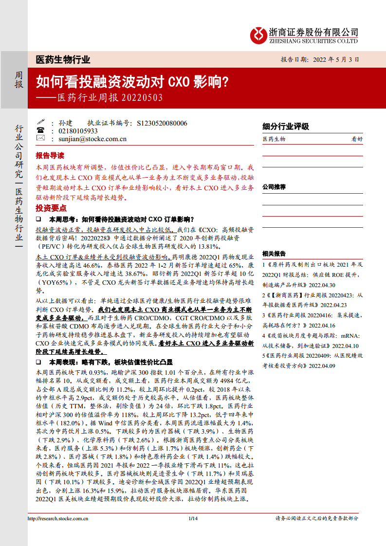 医药行业周报:如何看投融资波动对CXO影响?
