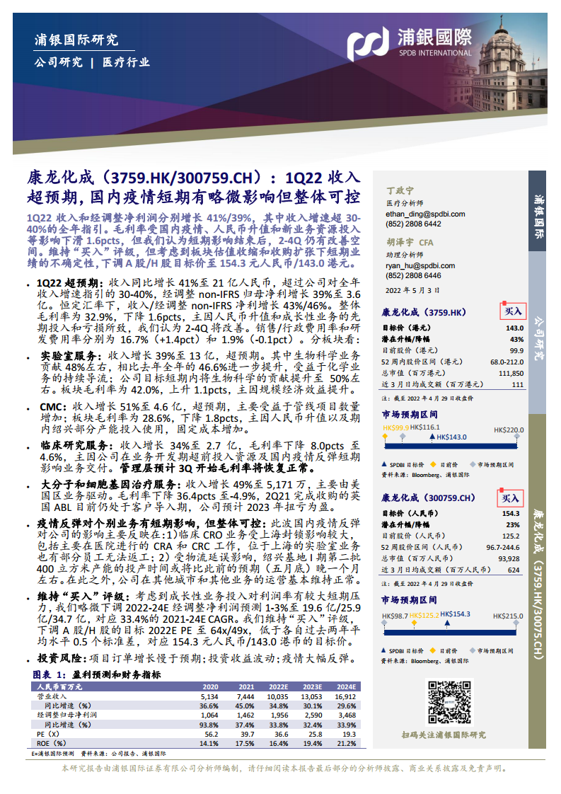 康龙化成(3759.HK 300759.CH):1Q22收入超预期,国内疫情有短期影响但整体可控