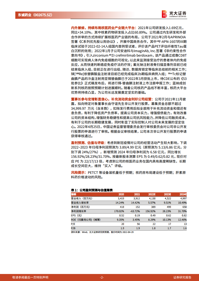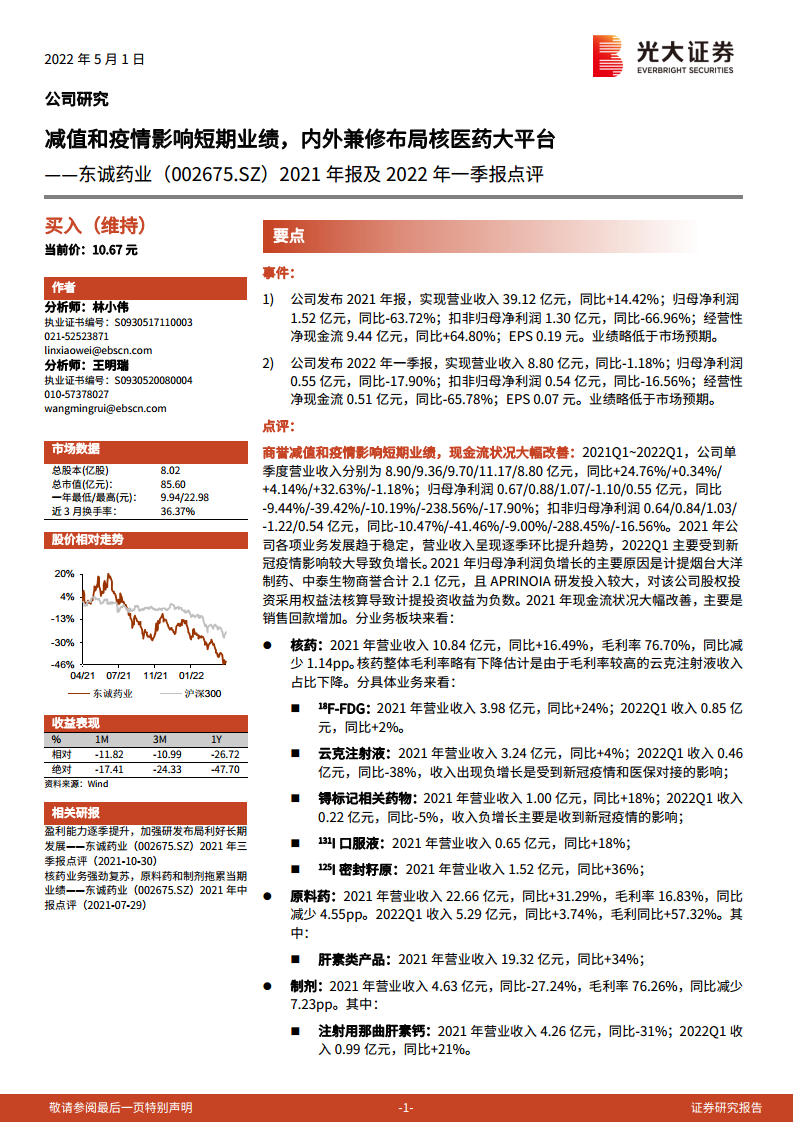 2021年报及2022年一季报点评:减值和疫情影响短期业绩,内外兼修布局核医药大平台