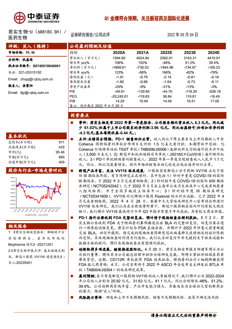 君实生物(688180):Q1业绩符合预期,关注新冠药及国际化进展