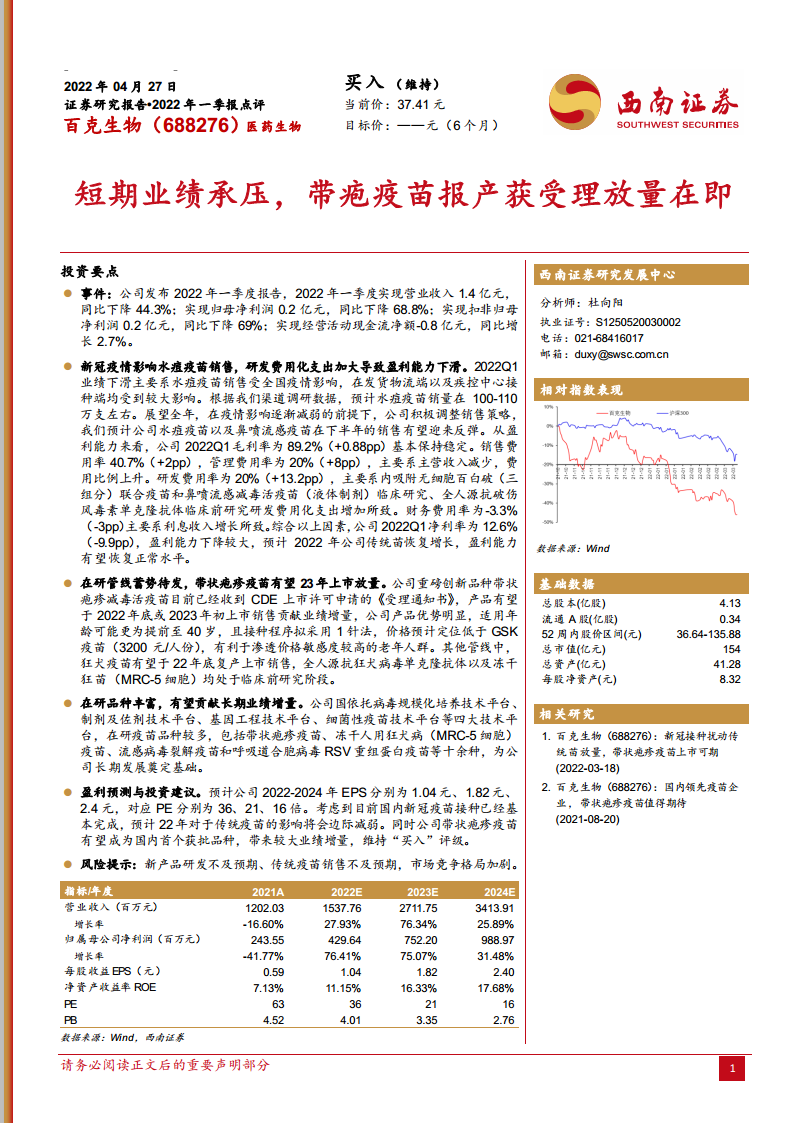 百克生物(688276):短期业绩承压,带疱疫苗报产获受理放量在即
