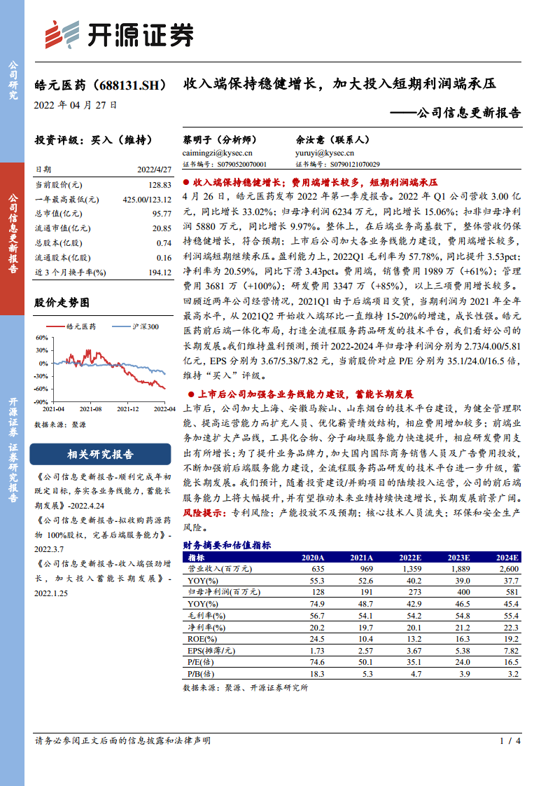 皓元医药(688131)公司信息更新报告:收入端保持稳健增长,加大投入短期利润端承压