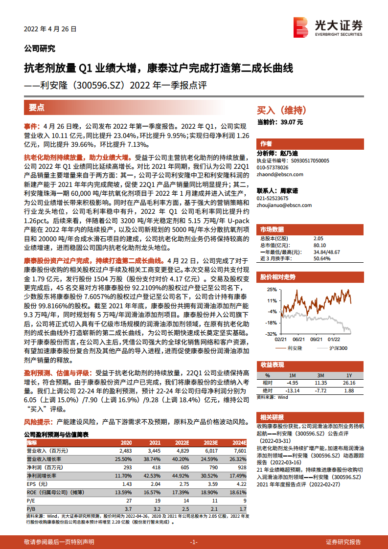 利安隆(300596)2022年一季报点评:抗老剂放量Q1业绩大增,康泰过户完成打造第二成长曲线