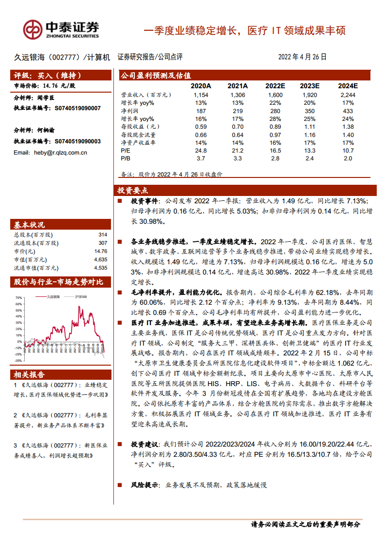久远银海(002777):一季度业绩稳定增长,医疗IT领域成果丰硕