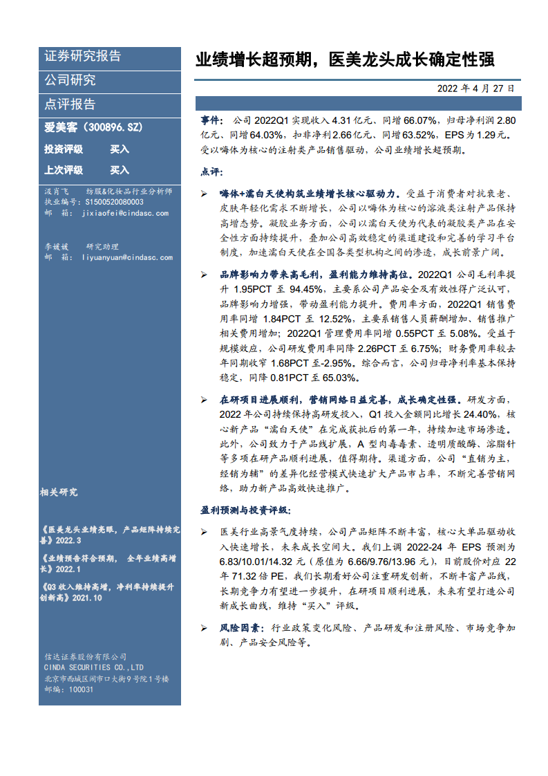 爱美客(300896):业绩增长超预期,医美龙头成长确定性强