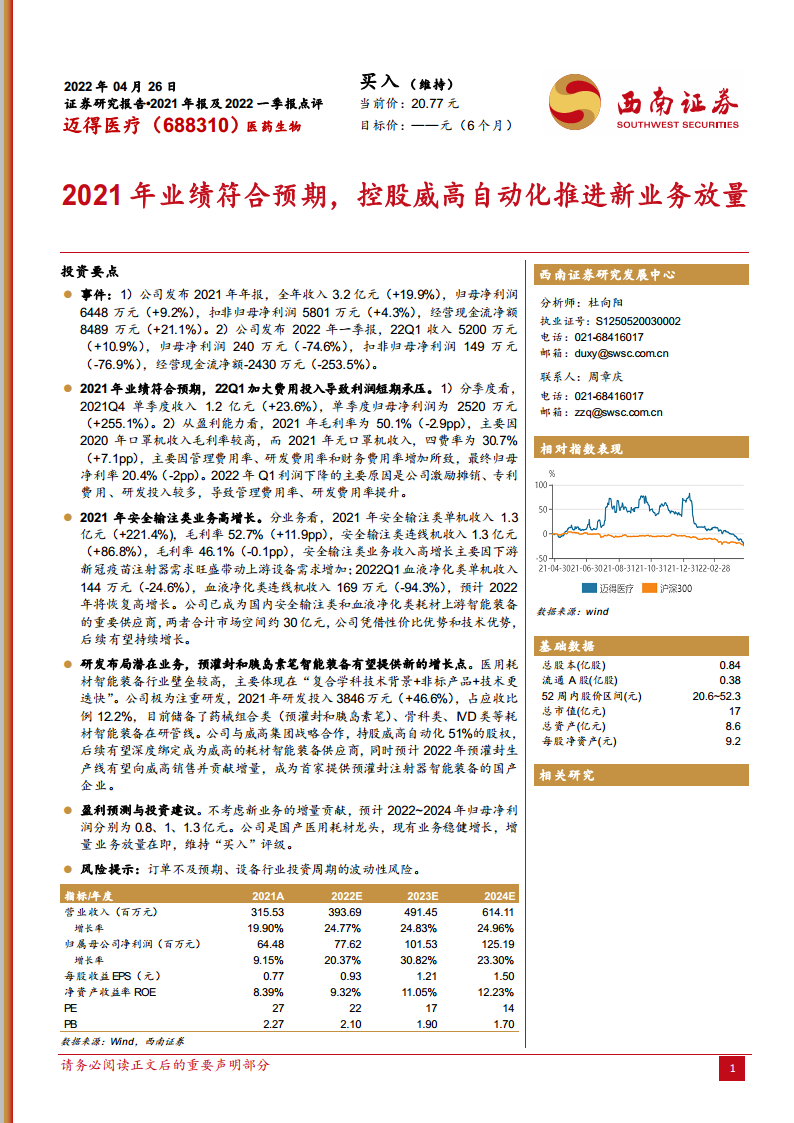 迈得医疗(688310):2021年业绩符合预期,控股威高自动化推进新业务放量