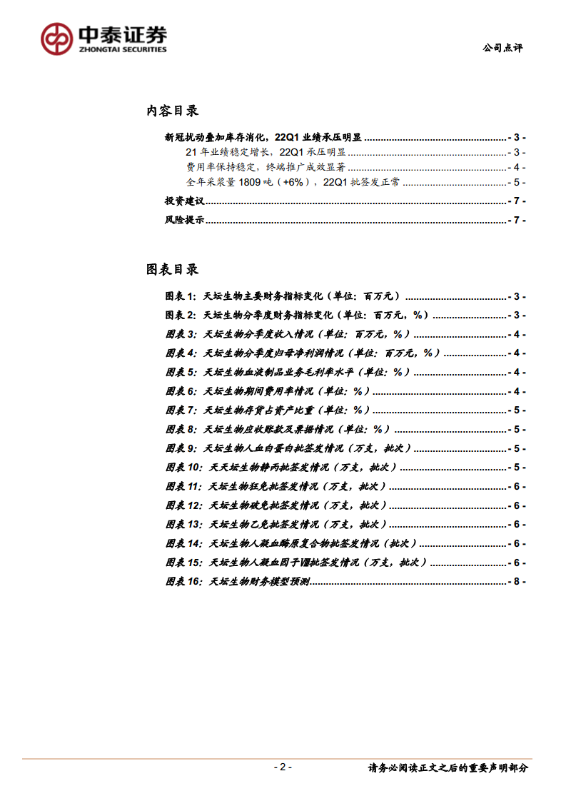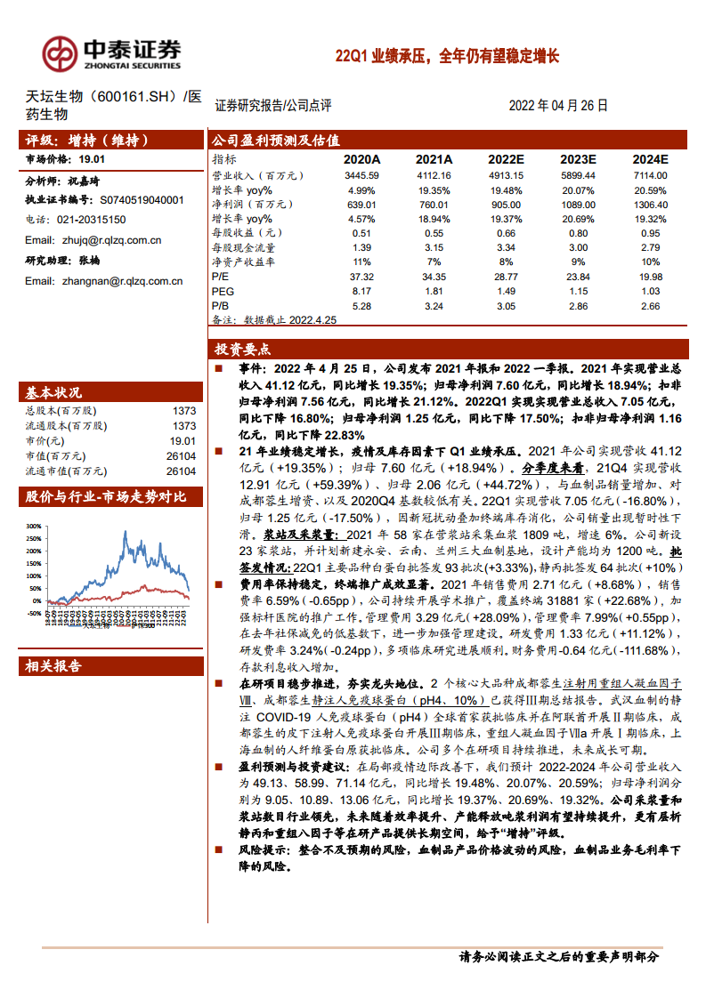 天坛生物(600161):22Q1业绩承压,全年仍有望稳定增长