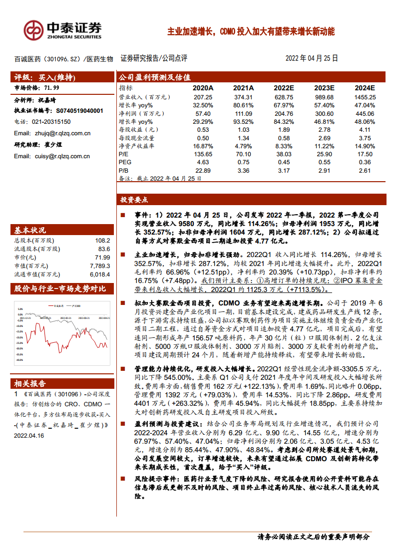 百诚医药(301096):主业加速增长,CDMO投入加大有望带来增长新动能