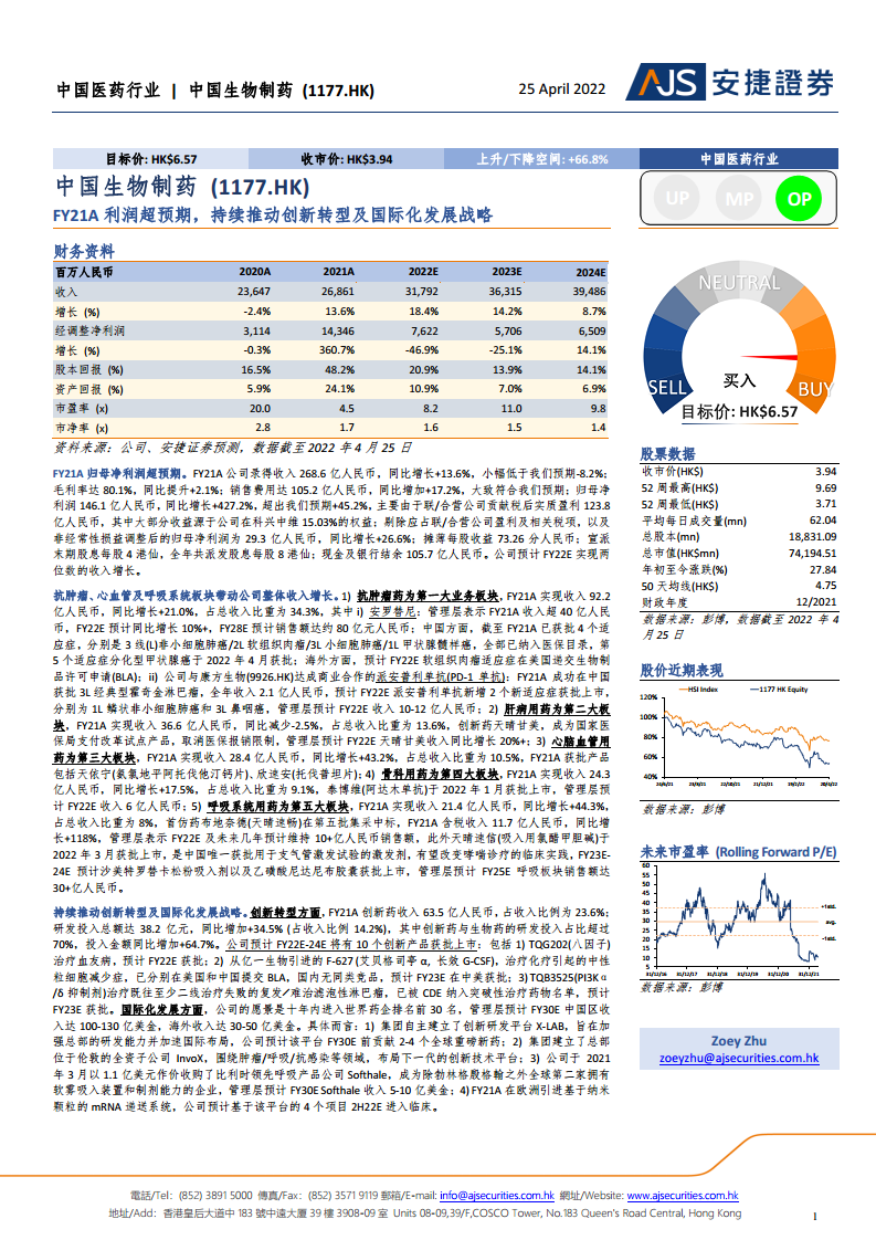 中国生物制药(01177):FY21A利润超预期,持续推动创新转型及国际化发展战略