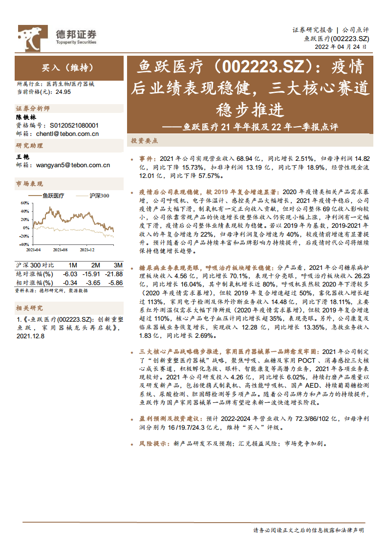 鱼跃医疗21年年报及22年一季报点评:疫情后业绩表现稳健,三大核心赛道稳步推进