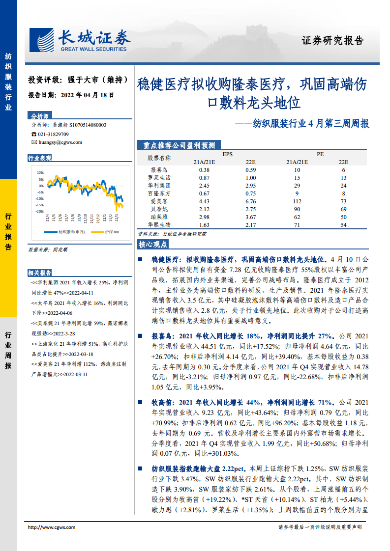 纺织服装行业4月第三周周报:稳健医疗拟收购隆泰医疗,巩固高端伤口敷料龙头地位