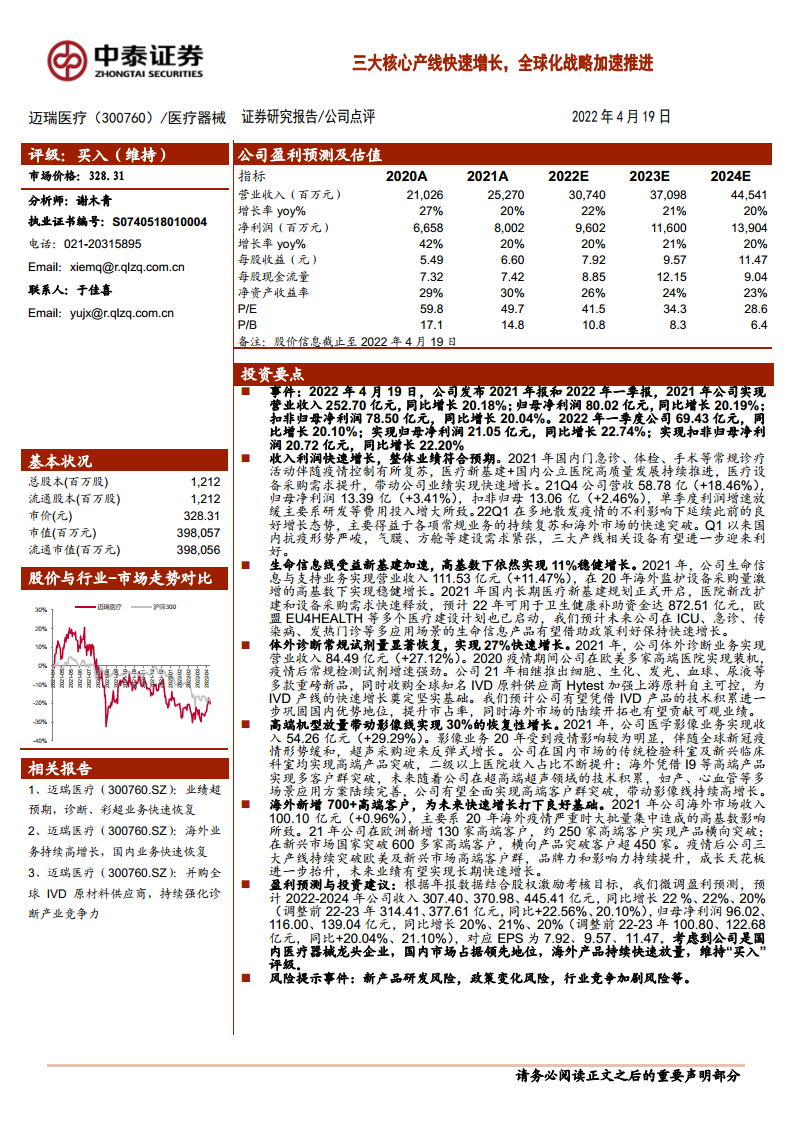 迈瑞医疗(300760):三大核心产线快速增长,全球化战略加速推进