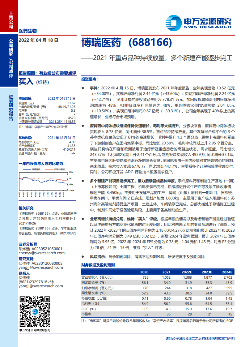 博瑞医药(688166):2021年重点品种持续放量,多个新建产能逐步完工