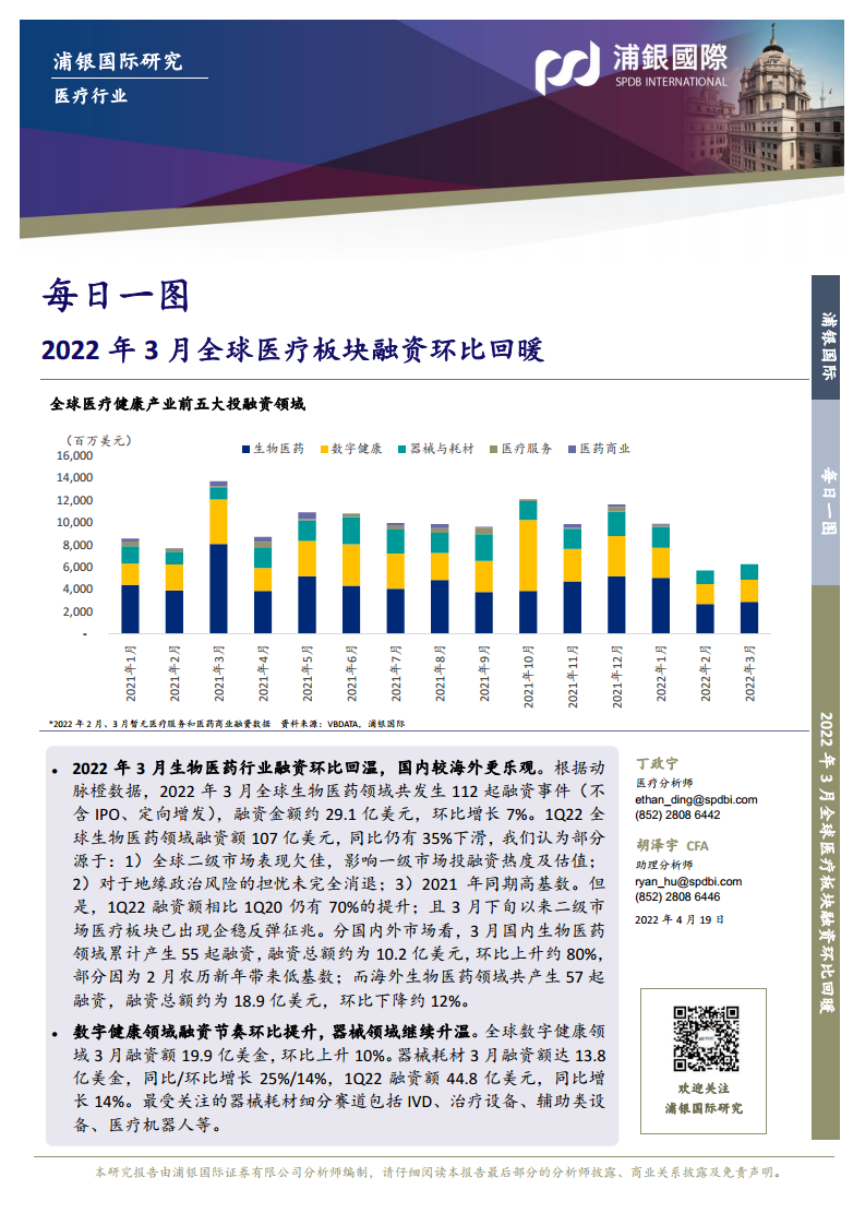 每日一图:2022年3月全球医疗板块融资环比回暖