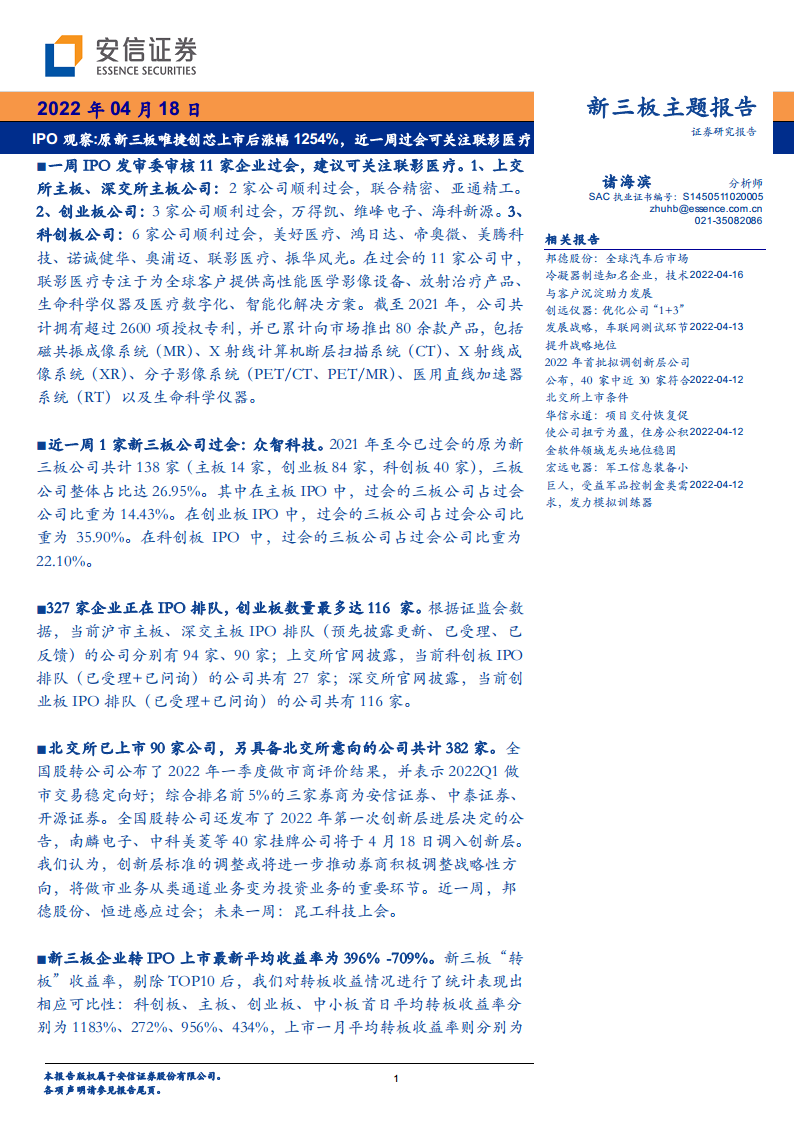 IPO观察:原新三板唯捷创芯上市后涨幅1254%,近一周过会可关注联影医疗