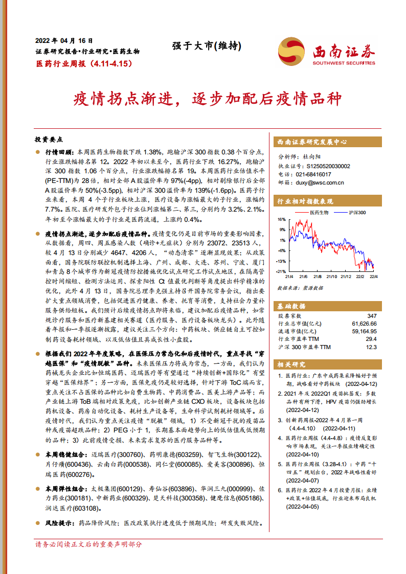 医药行业周报:疫情拐点渐进,逐步加配后疫情品种