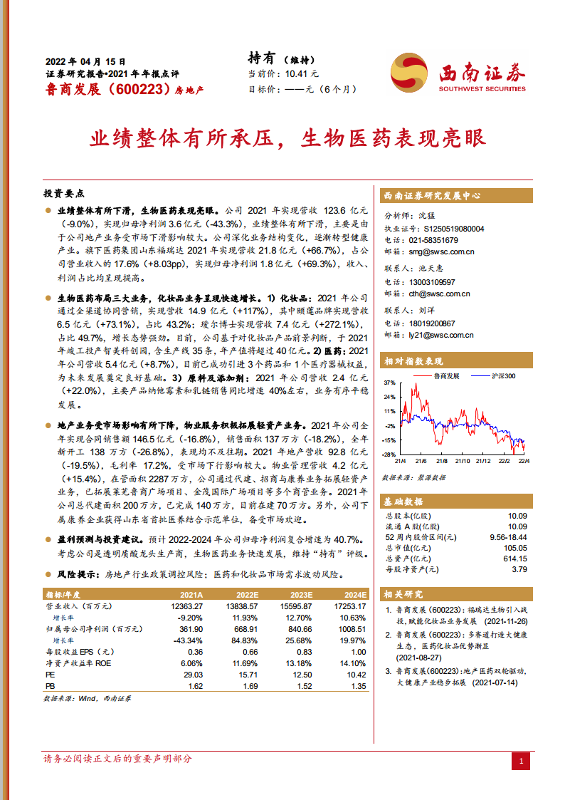 鲁商发展(600223):业绩整体有所承压,生物医药表现亮眼