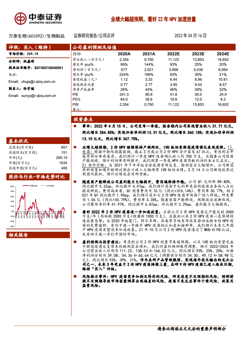 万泰生物(603392):业绩大幅超预期,看好22年HPV加速放量