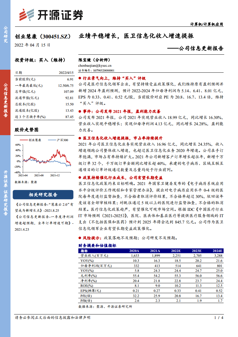 创业慧康(300451)公司信息更新报告:业绩平稳增长,医卫信息化收入增速提振