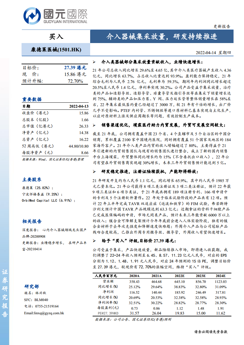 康德莱医械(01501):介入器械集采放量,研发持续推进
