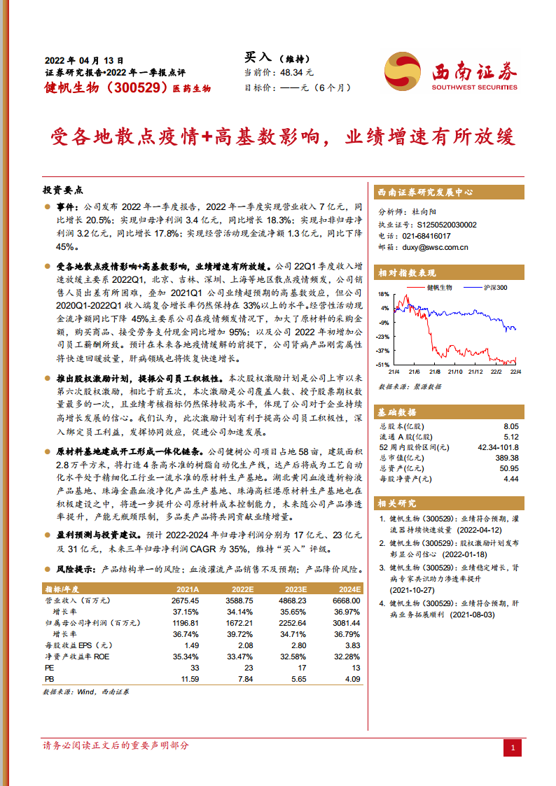 健帆生物(300529):受各地散点疫情+高基数影响,业绩增速有所放缓