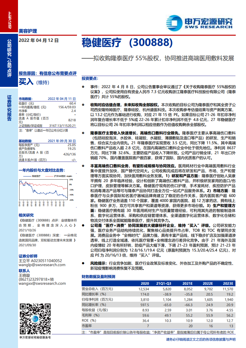 稳健医疗(300888):拟收购隆泰医疗55%股权,协同推进高端医用敷料发展