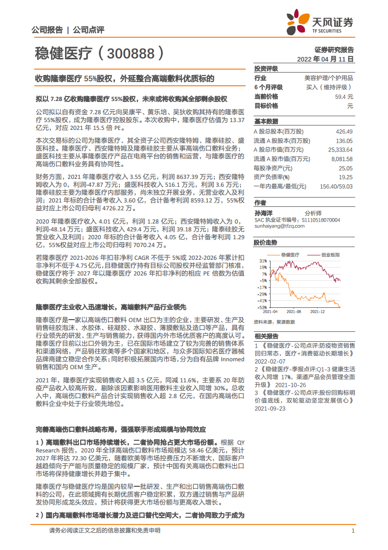 稳健医疗(300888):收购隆泰医疗55%股权,外延整合高端敷料优质标的