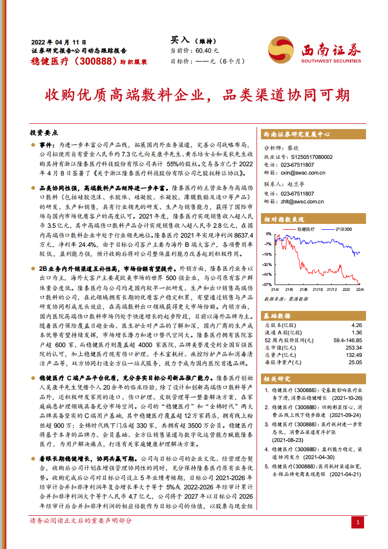 稳健医疗(300888):收购优质高端敷料企业,品类渠道协同可期