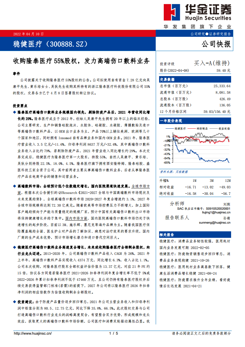 收购隆泰医疗55%股权,发力高端伤口敷料业务