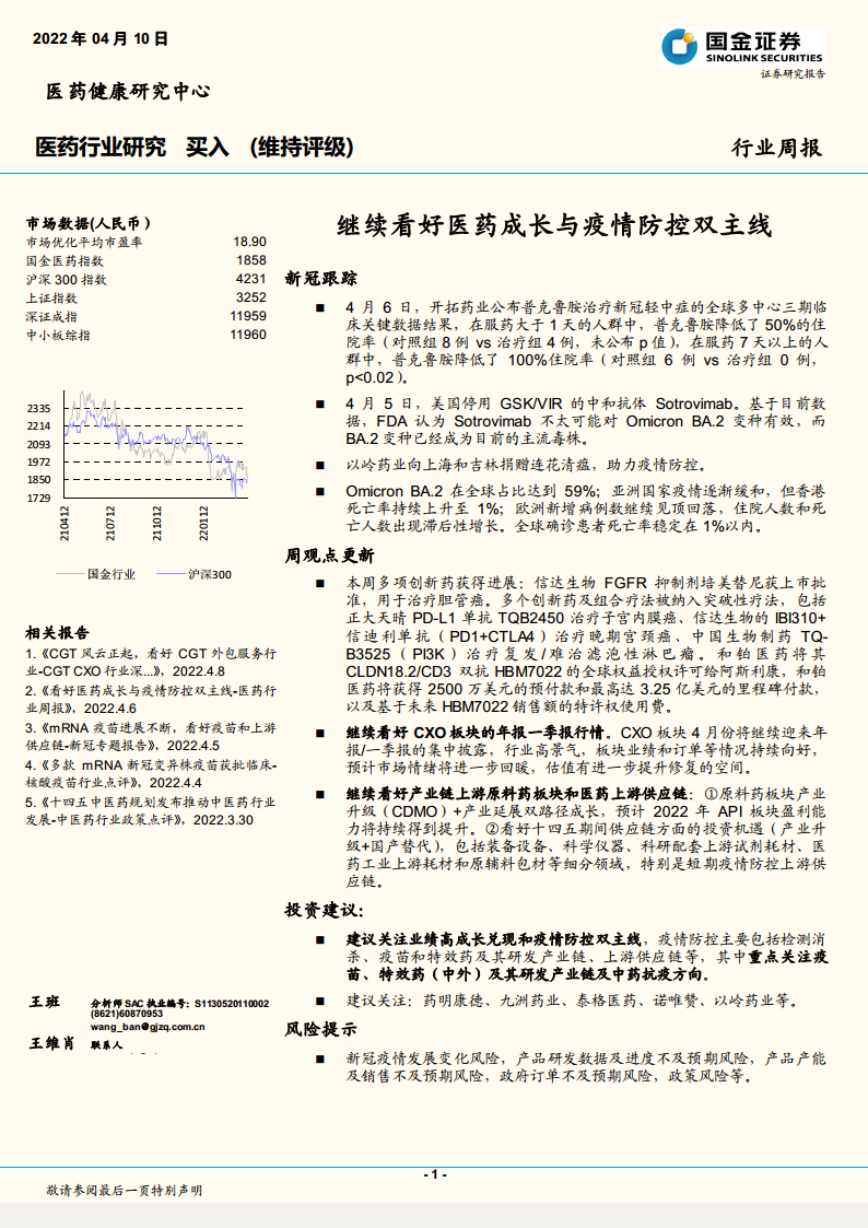 继续看好医药成长与疫情防控双主线