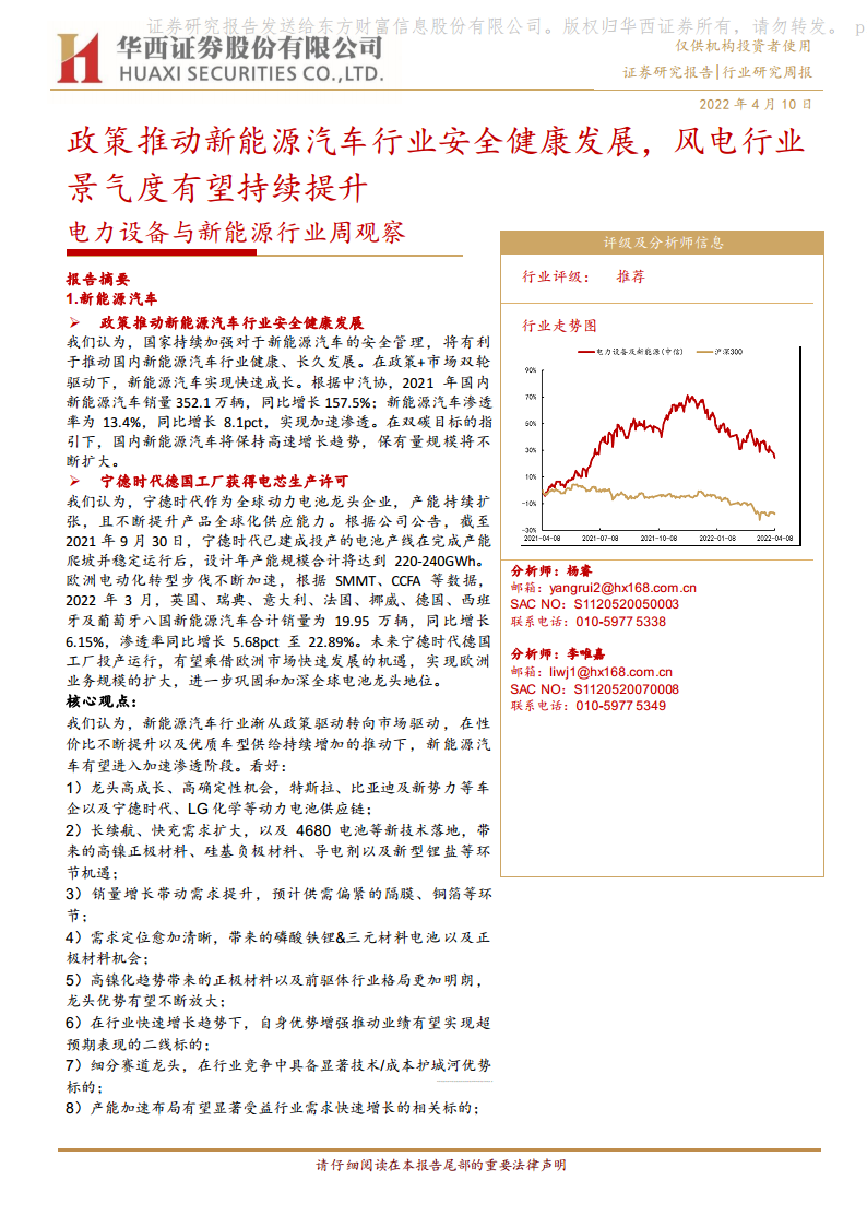 电力设备与新能源行业周观察:政策推动新能源汽车行业安全健康发展,风电行业景气度有望持续提升