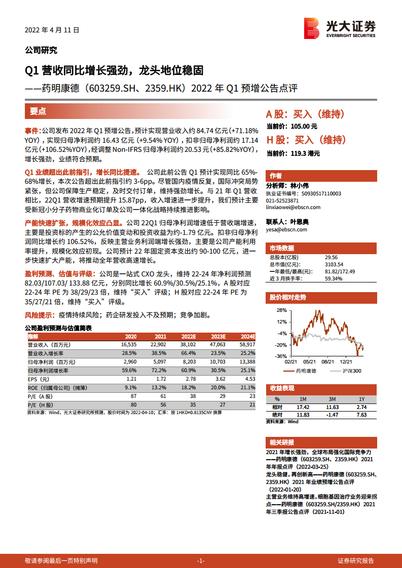 药明康德(603259)2022年Q1预增公告点评:Q1营收同比增长强劲,龙头地位稳固