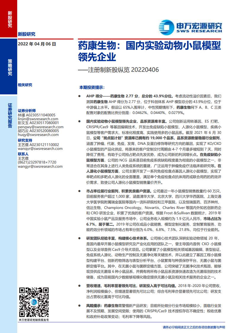 药康生物(688046):国内实验动物小鼠模型领先企业