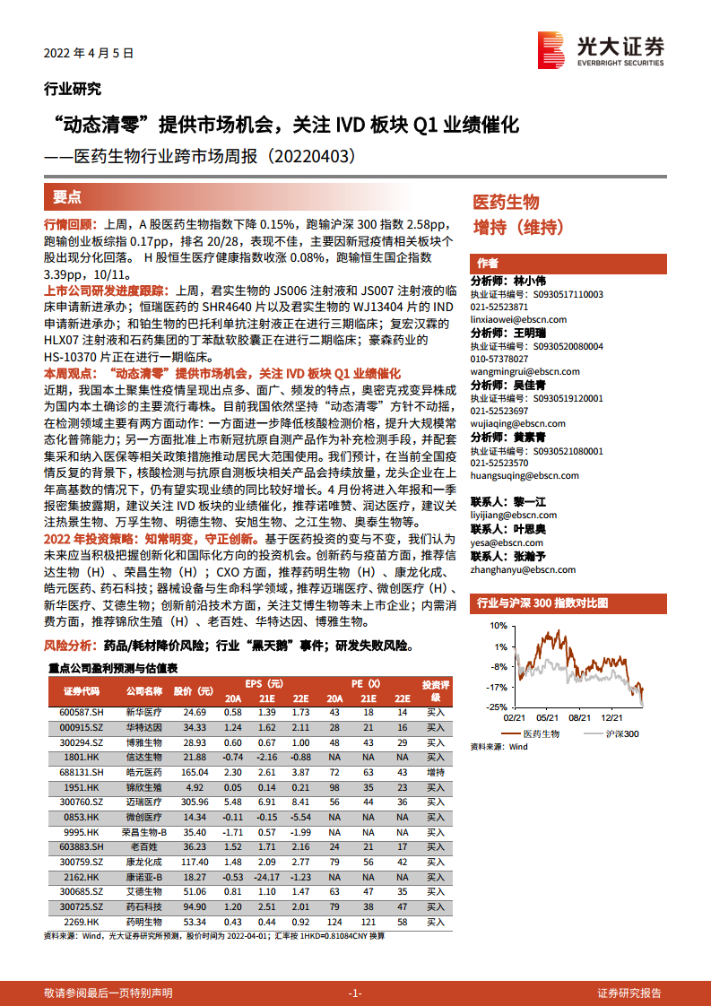 医药生物行业跨市场周报:“动态清零”提供市场机会,关注IVD板块Q1业绩催化