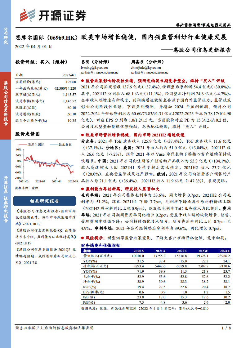 思摩尔国际(06969)港股公司信息更新报告:欧美市场增长稳健,国内强监管利好行业健康发展