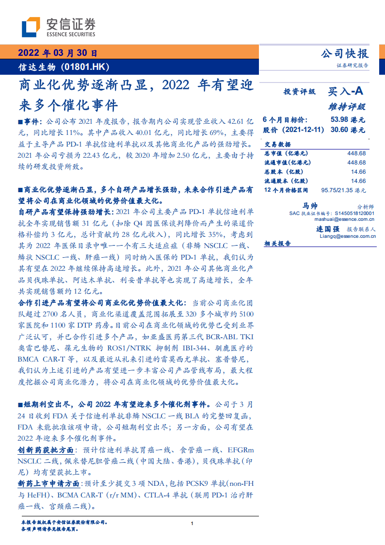 信达生物(01801):商业化优势逐渐凸显,2022年有望迎来多个催化事件