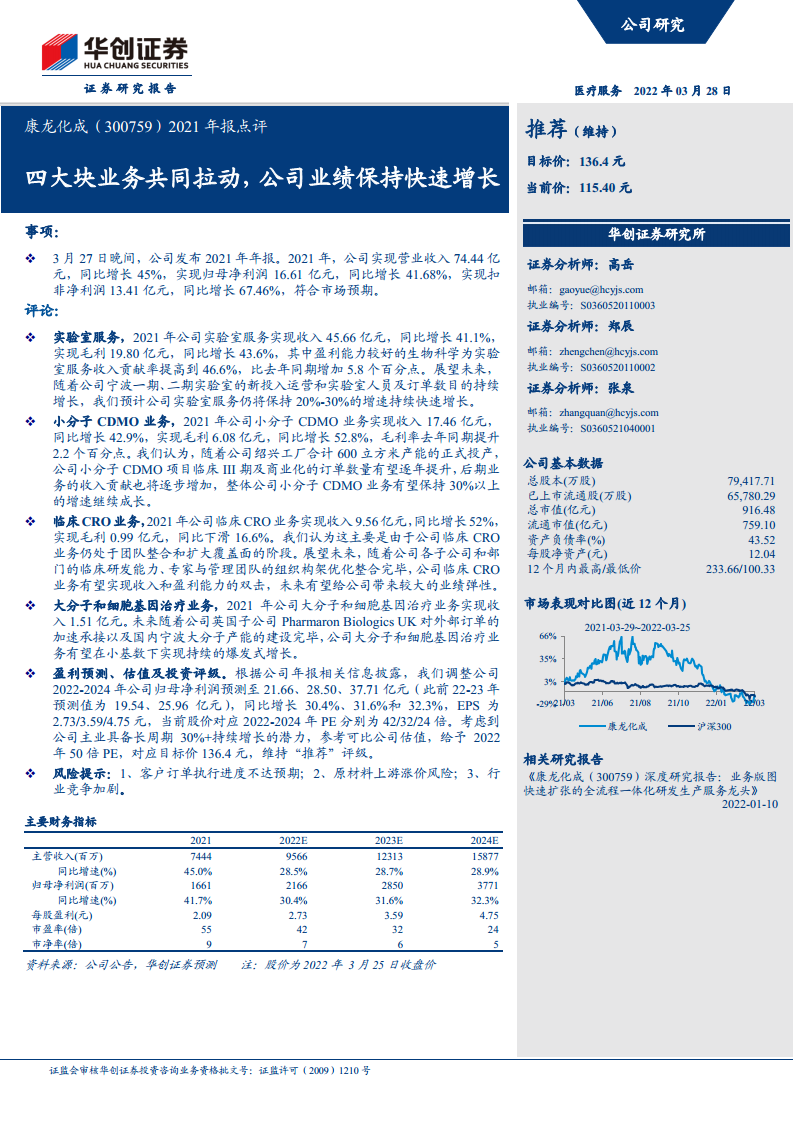 康龙化成(300759)2021年报点评:四大块业务共同拉动,公司业绩保持快速增长