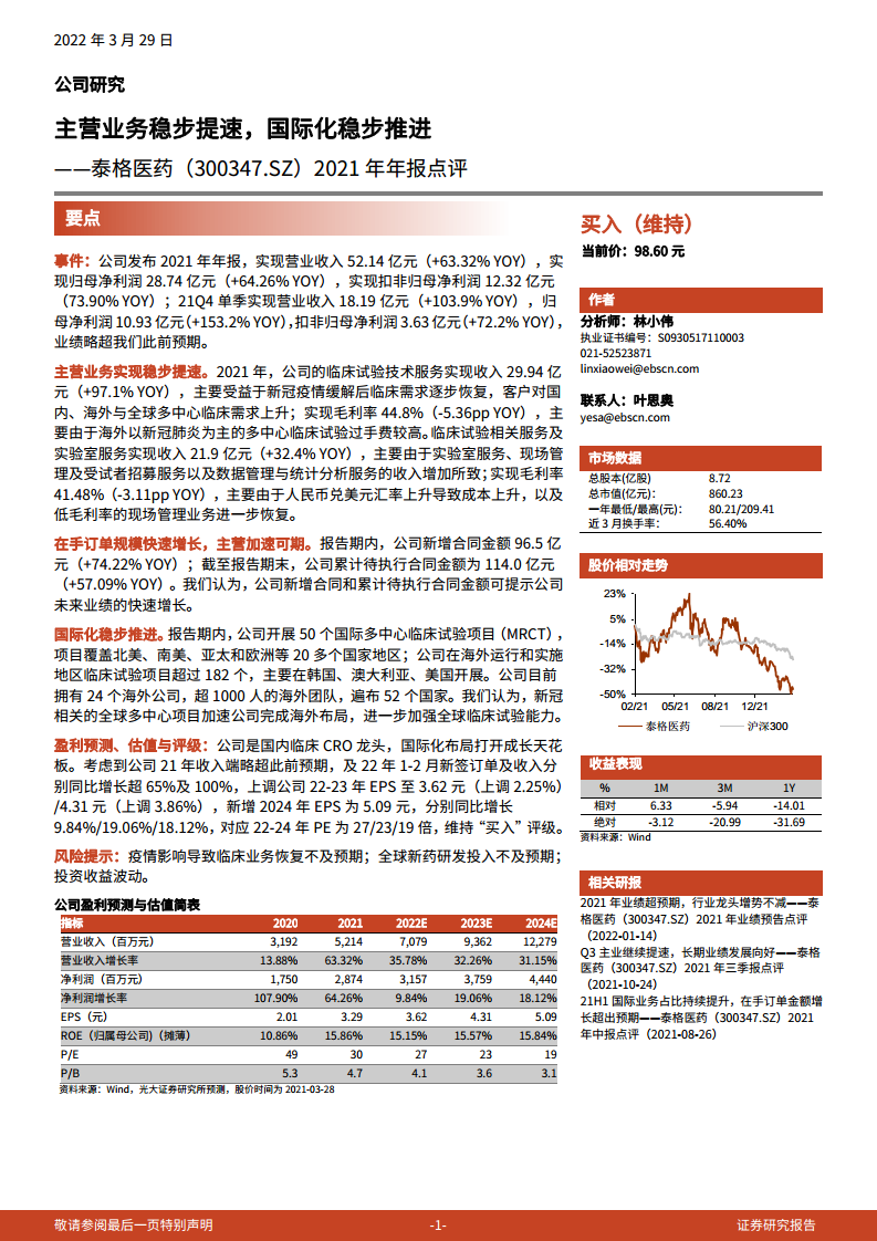 泰格医药(300347)2021年年报点评:主营业务稳步提速,国际化稳步推进