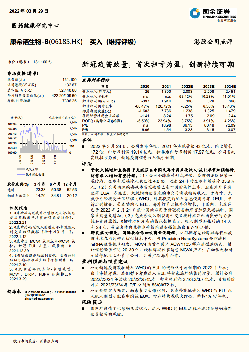 康希诺生物-B(06185):新冠疫苗放量,首次扭亏为盈,创新持续可期