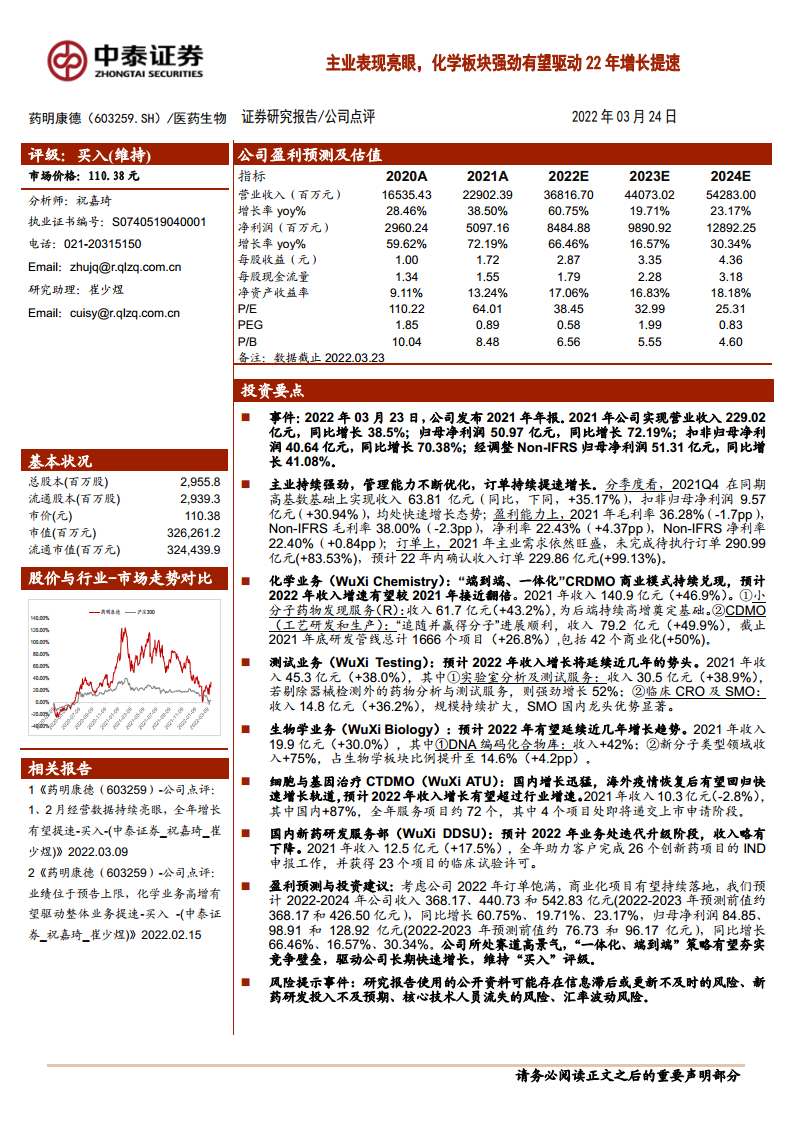 药明康德(603259):主业表现亮眼,化学板块强劲有望驱动22年增长提速