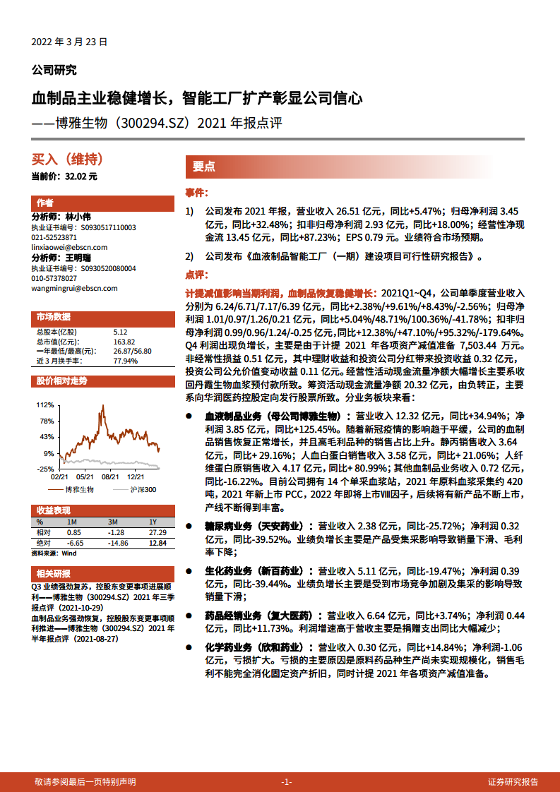 博雅生物(300294):血制品主业稳健增长,智能工厂扩产彰显公司信心