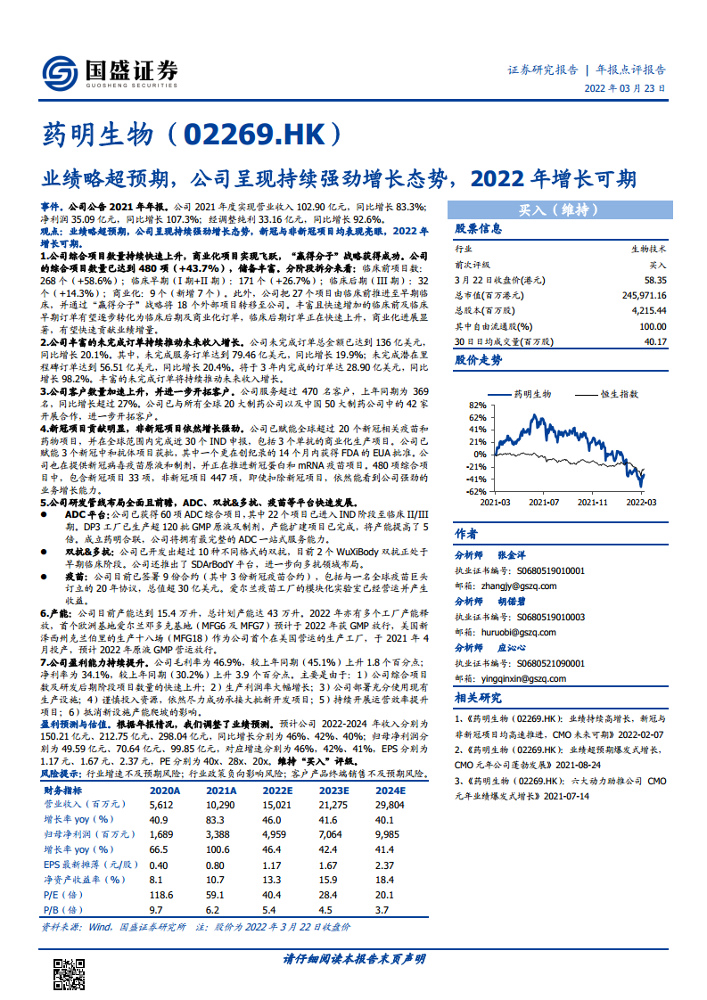 药明生物(02269):业绩略超预期,公司呈现持续强劲增长态势,2022年增长可期