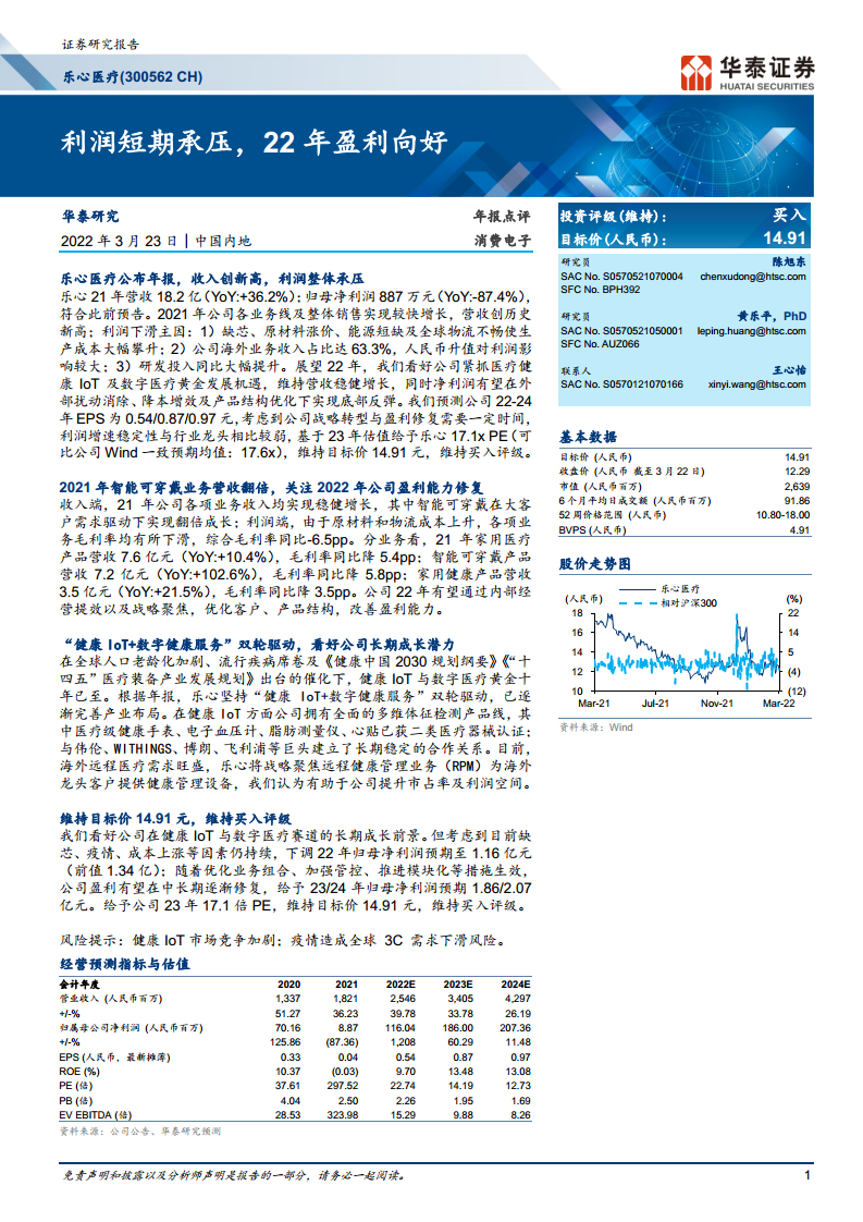 乐心医疗(300562):利润短期承压,22年盈利向好