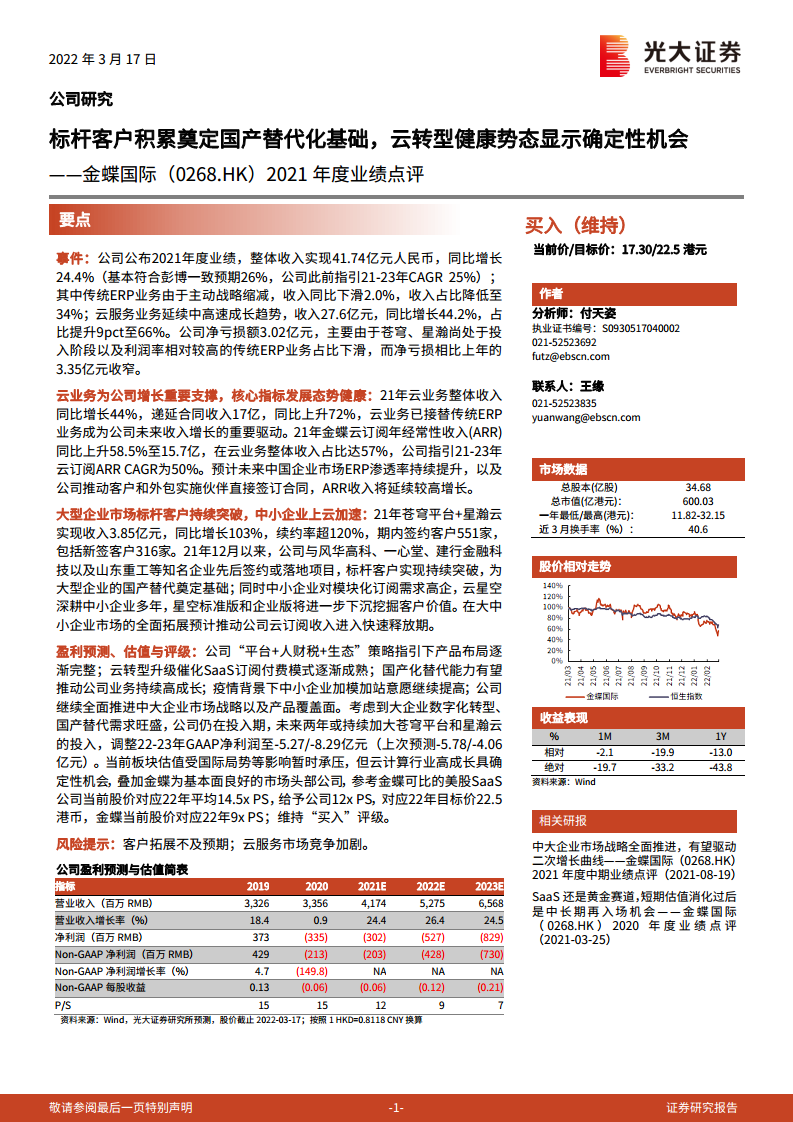 金蝶国际(00268)2021年度业绩点评:标杆客户积累奠定国产替代化基础,云转型健康势态显示确定性机会