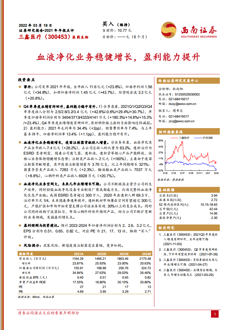 三鑫医疗(300453):血液净化业务稳健增长,盈利能力提升