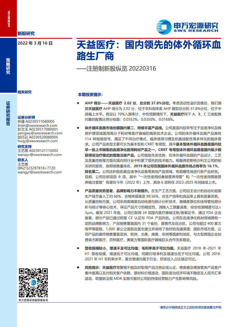 天益医疗(301097):国内领先的体外循环血路生厂商