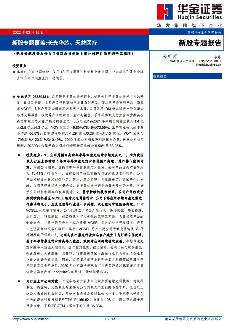 长光华芯(688048)新股专题覆盖:长光华芯、天益医疗