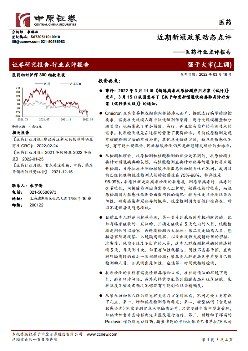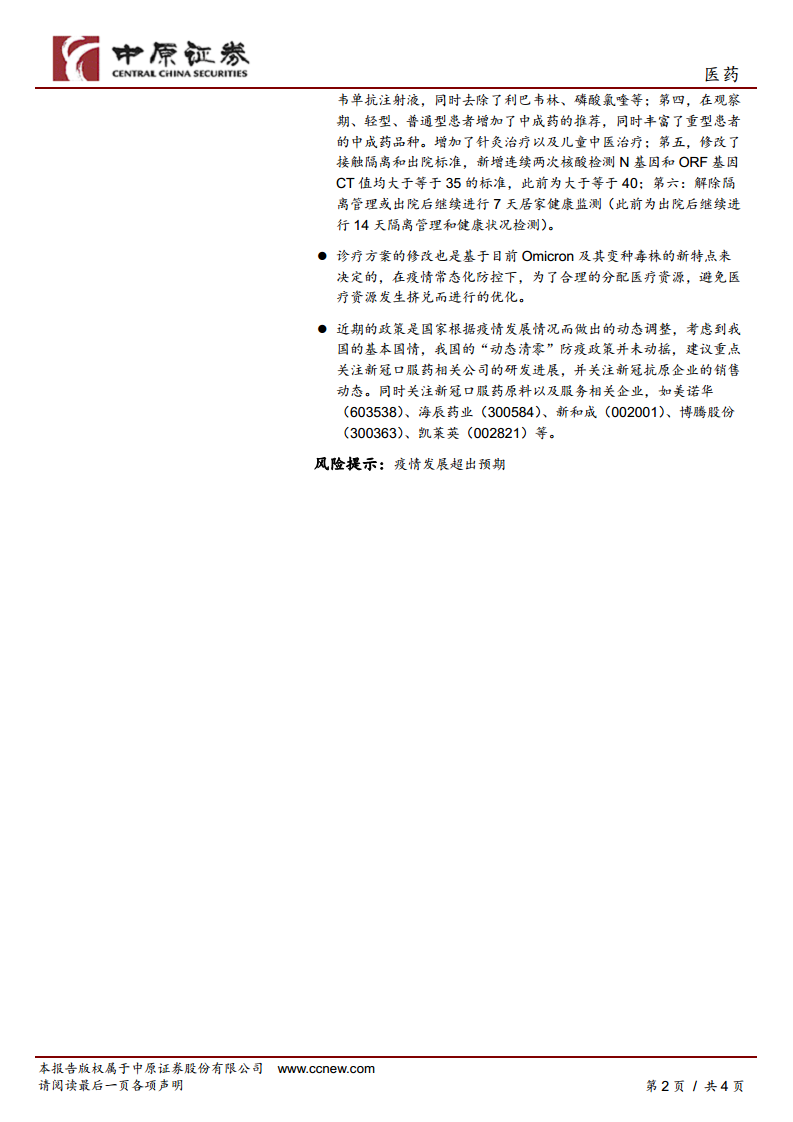 医药行业点评报告:近期新冠政策动态点评