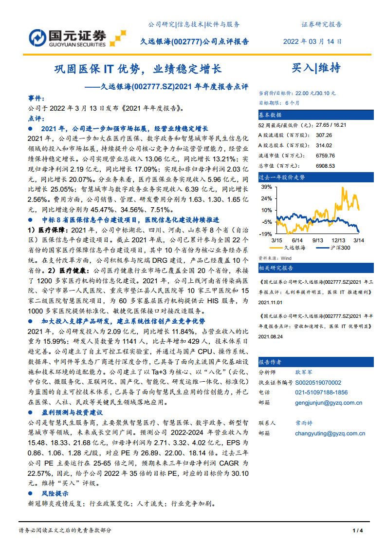 久远银海(002777):巩固医保IT优势,业绩稳定增长